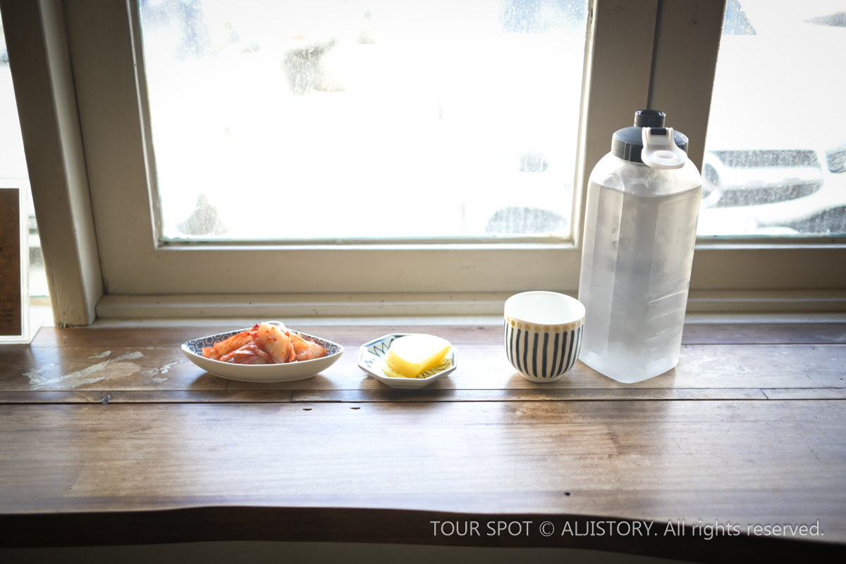 홀 중앙에 셀프로 김치와 단무지를 가져다 먹게 되어 있어요.