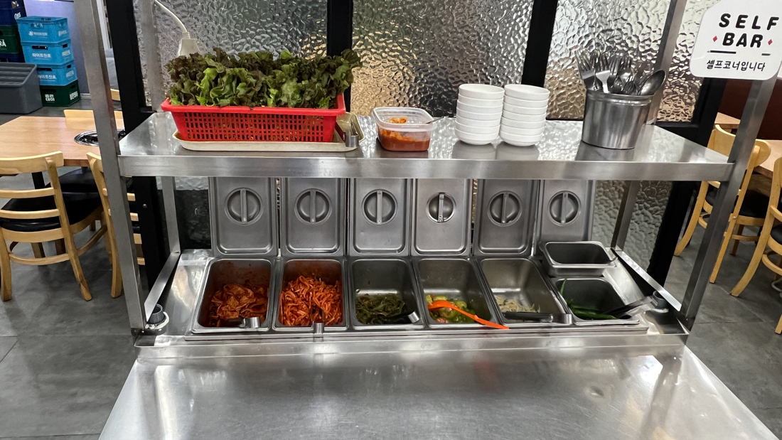 ‘태백집2020’의 또 다른 매력은 바로 셀프바예요. 무생채, 어묵볶음, 숙주나물 등 정갈한 기본 밑반찬과 신선한 쌈 채소를 원하는 만큼 가져다 먹을 수 있어 정말 좋았어요.